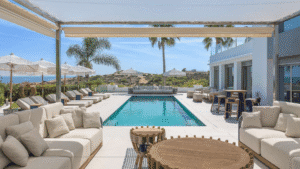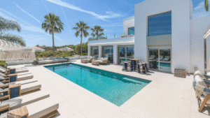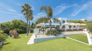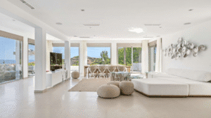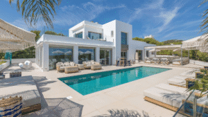 This modern and tastefully decorated villa offers an exceptional location in Cap Martinet, just minutes from Ibiza Town, Marina Botafoch, and Talamanca Beach. Boasting breathtaking views of the sea and Formentera, as well as a private bay only 50 metres away within a nature reserve, this property is a true island gem. Spread across 280 m² of living space on a 2,000 m² plot, it features five stylish bedrooms, including a master suite with a private terrace and lounge, and a detached guest room with its own entrance. The bright lounge opens to expansive terraces through large sliding glass doors, while the fully equipped kitchen comes with modern appliances including a Nespresso coffee machine. Outdoors, the private pool is surrounded by sunbeds and a sleek lounge area, creating the perfect setting for relaxation or entertaining. Additional amenities include air conditioning throughout, Sonos sound system, alarm, electric carport, laundry room, and ample storage. With its privacy, luxury, and unbeatable views, this villa promises an unforgettable Ibiza experience.