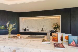 Interiors: Elegant living room, designer kitchen with dining area, and private wine cellar.